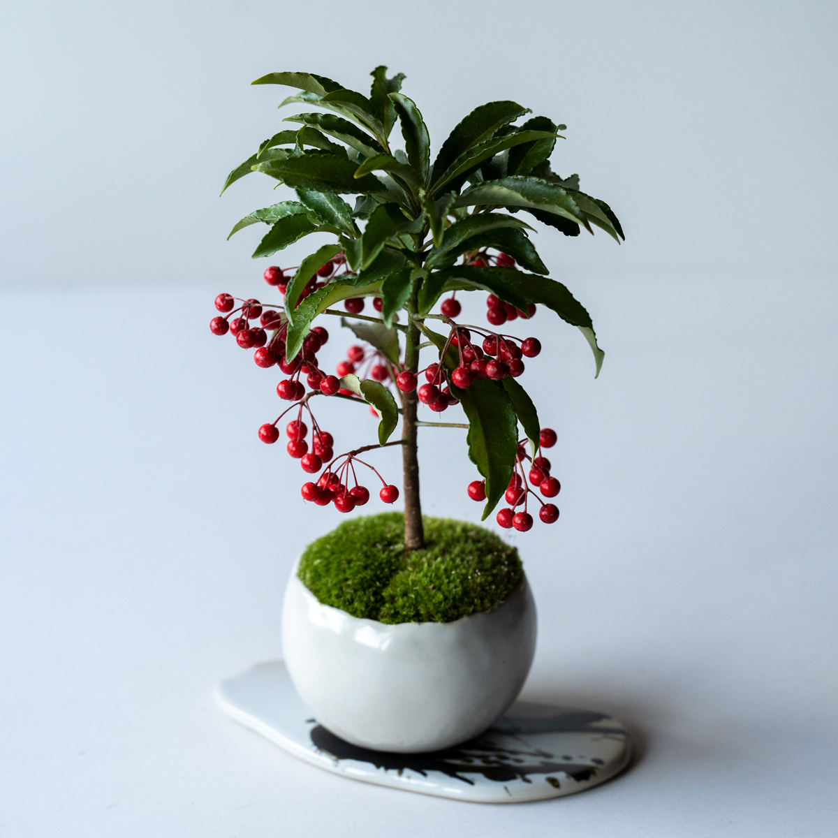 その姿は孤島に立つ1本のヤシの木のよう…。シンプルな佇まいながら不思議と強い存在感を放ちます。丸く波打つ葉の下に、たわわに実る赤く艶ややかな実は「赤い宝石」とも呼ばれています。その華やかさと、「万両」というめでたい名前から、お正月や商売繁盛の縁起植物として古くから親しまれています。